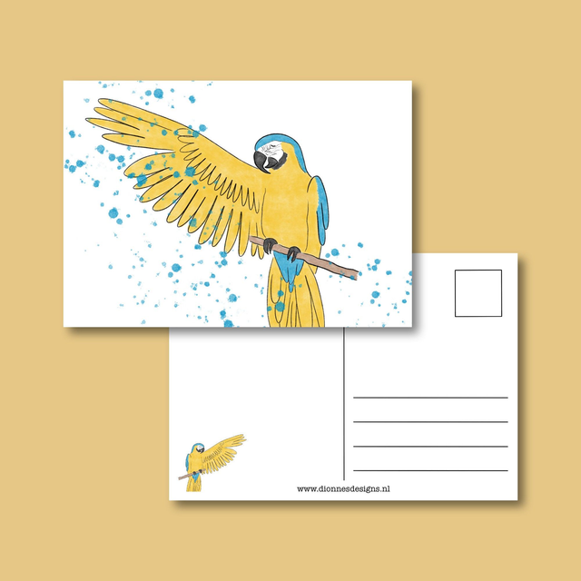 Ansichtkaart blauwgele ara, 10 x 15 cm